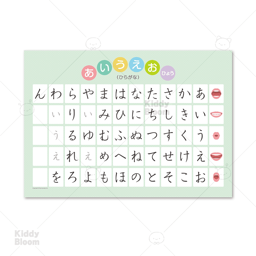 日本語46文字とともに、「あ・い・う・え・お」の発音を口のイラストで表示しています。